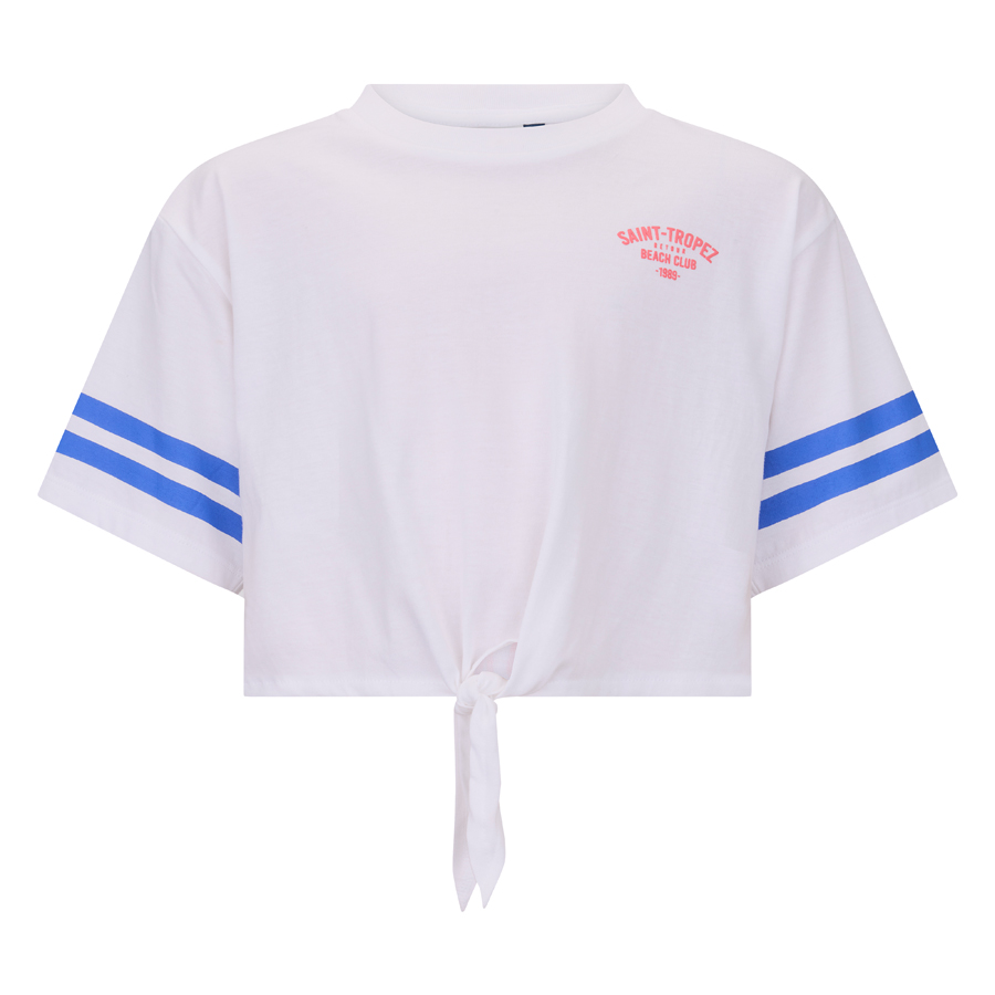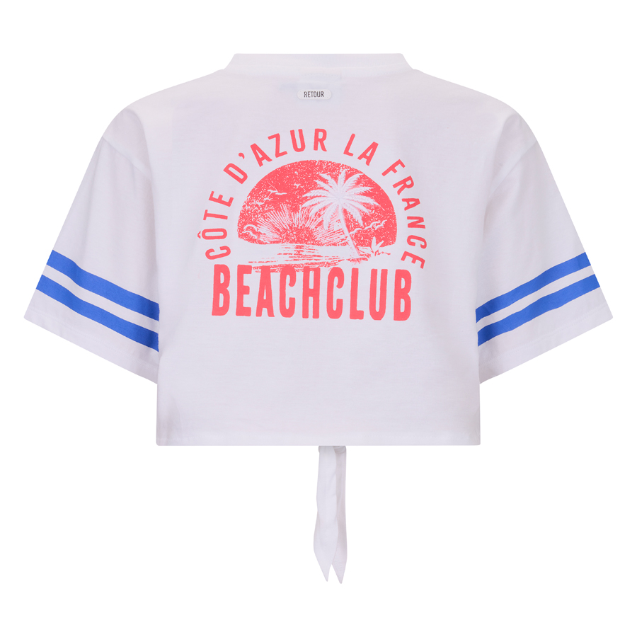 • Kort T-shirt uit de zomercollectie van Retour Jeans met een boxy pasvorm en strikdetail aan onderzijde. De top heeft korte mouwen.