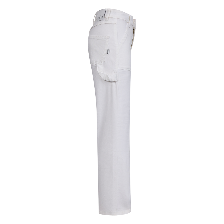 • Deze broek uit de zomercollectie van Retour Jeans heeft een rechte fit. Het model heeft een hoge taille en licht uitlopende pijpen met grote steekzakken. Voorzien van een verstelbaar elastiek in de taille en een gulp met knoop- en ritssluiting.