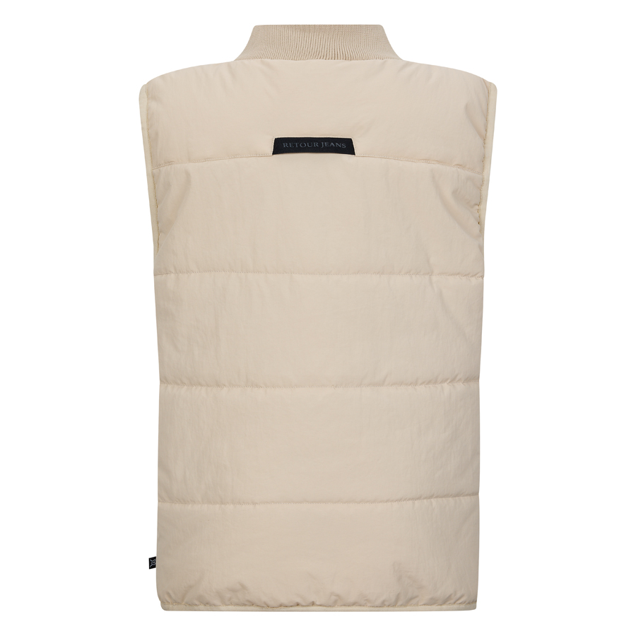 • Een licht gewatteerde bodywarmer uit de zomercollectie van Retour Jeans met een opstaande boord en een ritssluiting met kin bescherming. De bodywarmer heeft zakken met klep en klittenbandsluiting.