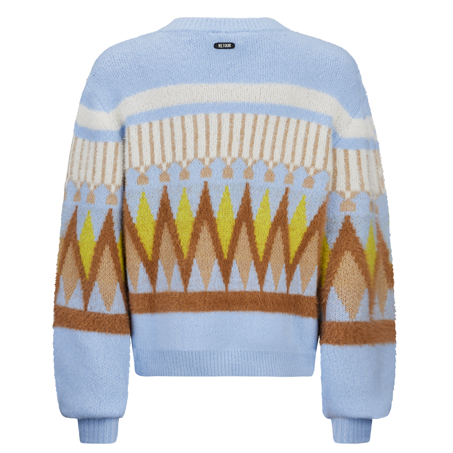 • Een fijngebreide trui van zachte kwaliteit uit de wintercollectie van Retour Jeans. De trui heeft een ribgebreide boord rond de hals, aan de onderkant en onder aan de mouwen en heeft lichte pofmouwen.