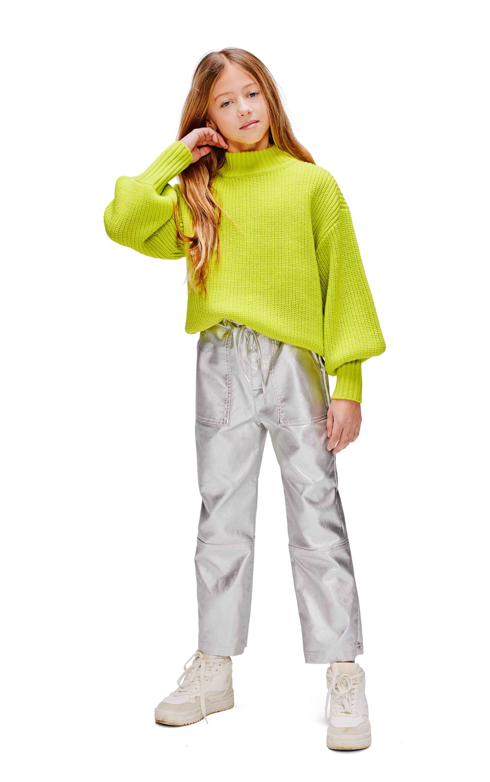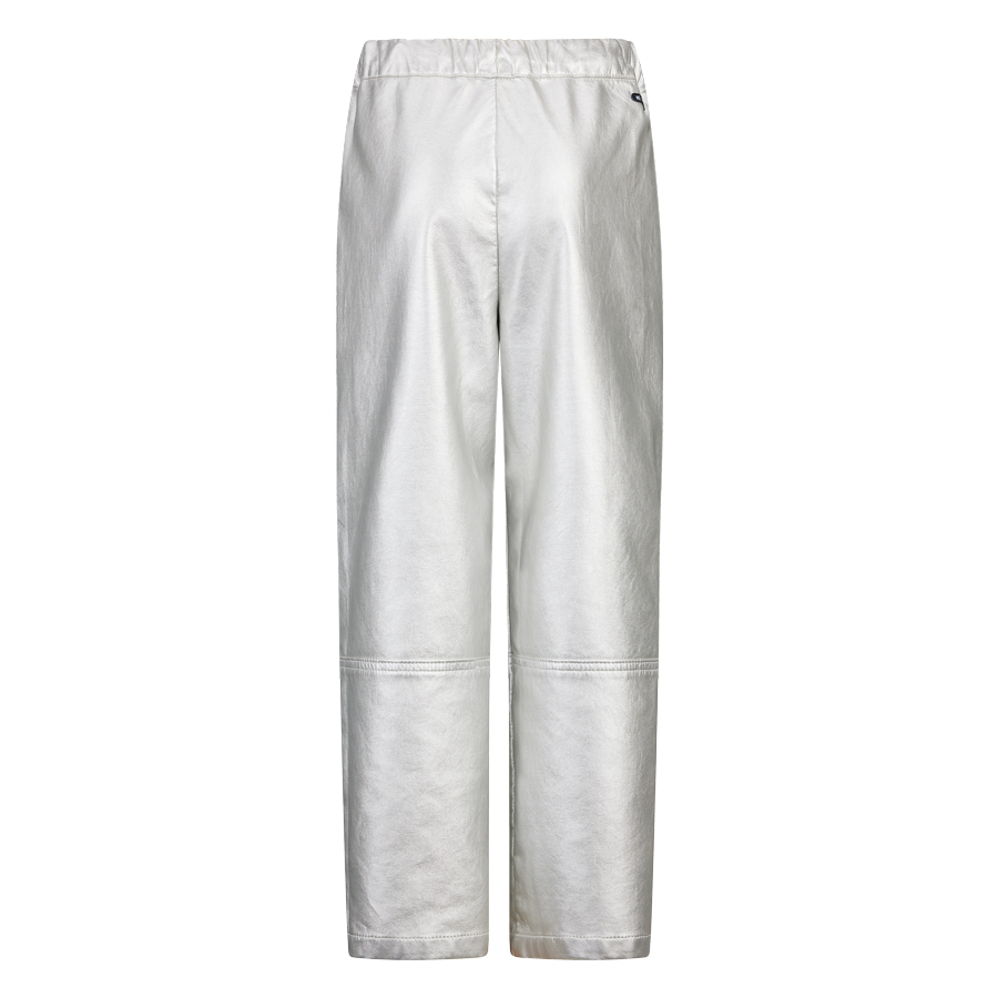 • Een zilveren PU-leren broek uit de wintercollectie van Retour Jeans met een hoge taille en rechte pijpen. De broek heeft bekleed elastiek in de taille en een aantrekkoord.