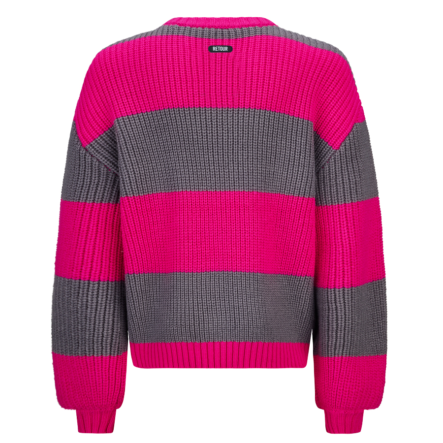 • Een ribgebreide trui uit de wintercollectie van Retour Jeans met een oversized fit. De trui heeft een ronde hals en een ribgebreide boord aan de onderkant en onder aan de mouwen.