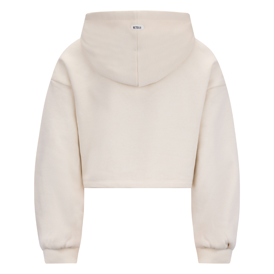 • Korte hoodie uit de wintercollectie van Retour Jeans. De hoodie heeft verlaagde schoudernaden een geribde boord onder aan de mouwen en loopt rond af aan de voorkant.