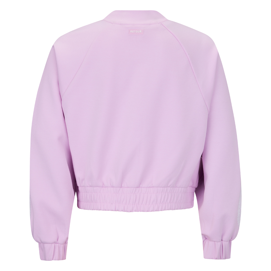• Een kort sweat vest met uit de zomercollectie van Retour Jeans. Het vest heeft een knoopsluiting voor, een opstaande boord langs de halsopening, en bekleed elastiek onderaan de mouwen in in de taille. Het model heeft steekzakken.