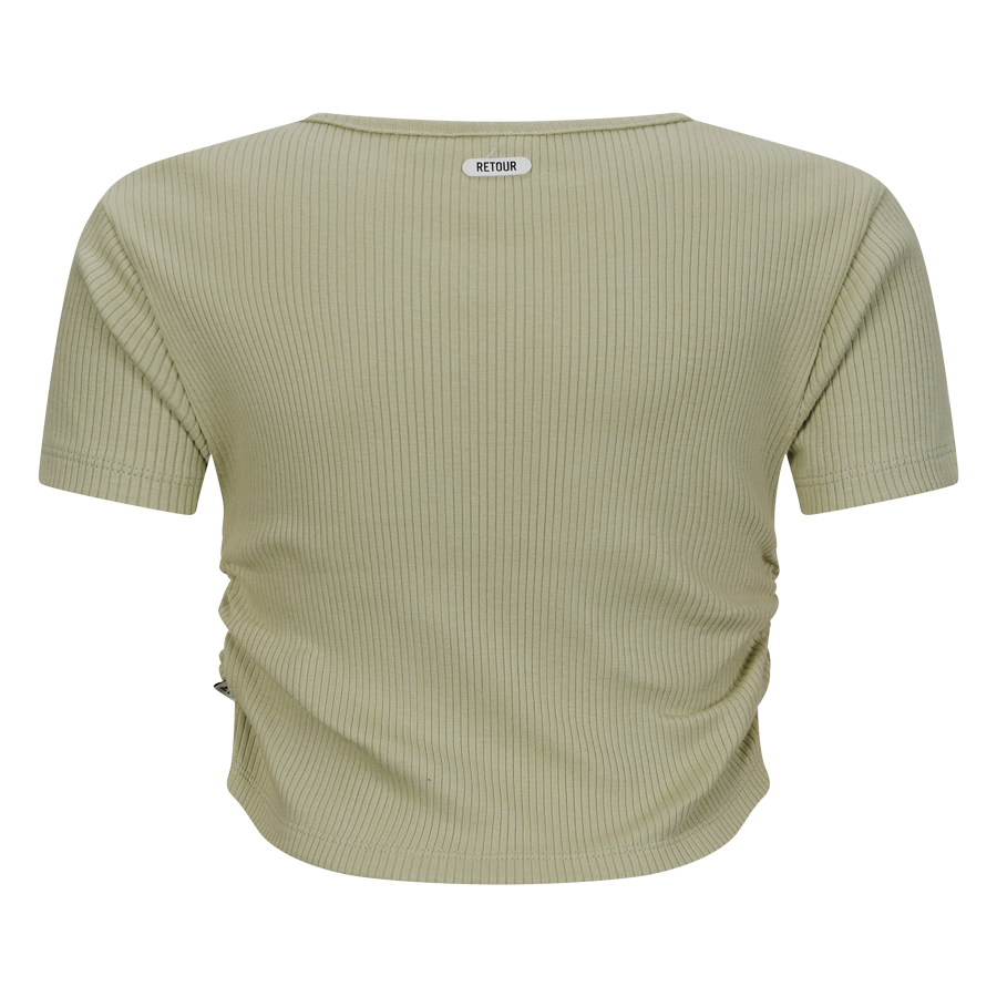 • Een korte nauwsluitende top van ribstof uit de zomercollectie van Retour Jeans met plooien in de zij naad en korte mouwen.