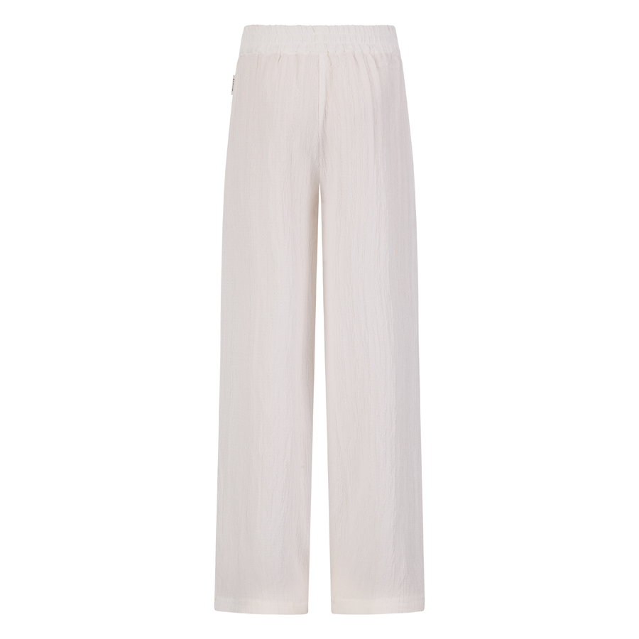 • Een luchtige broek van crinkle stof uit de zomercollectie van Retour Jeans met een hoge taille en wijde, licht uitlopende pijpen. De broek heeft bekleed elastiek in de taille en een aantrekkoord.