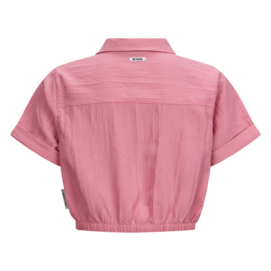 • Een cropped crinkleblouse uit de zomercollectie van Retour Jeans met kraagje. De blouse heeft knoopsluiting voor, korte mouwen en bekleed elastiek onderin.