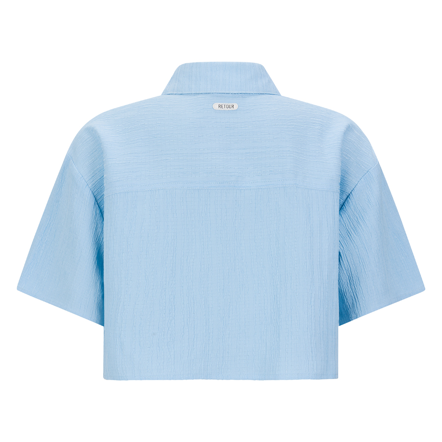 • Een wijdvallende cropped crinkleblouse uit de zomercollectie van Retour Jeans met kraagje. De blouse heeft knoopsluiting voor en korte mouwen.