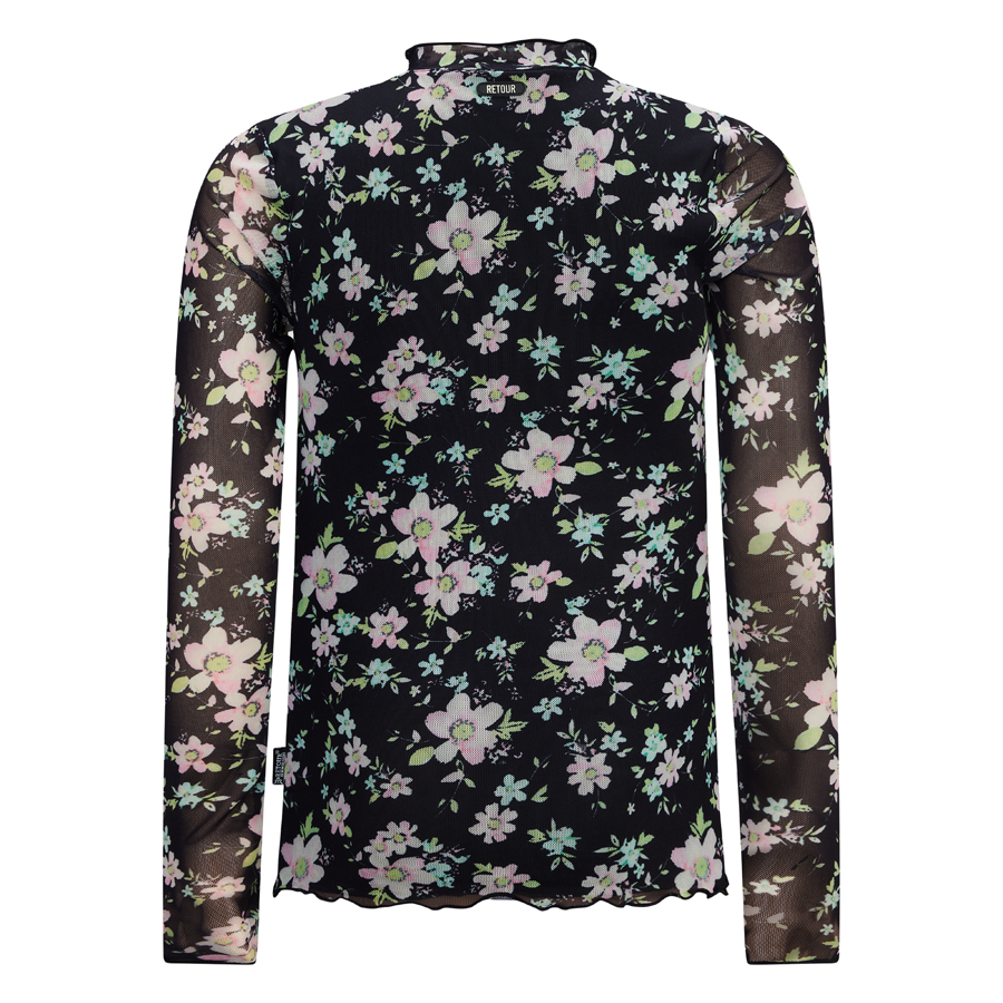 • Een nauwsluitende top van mesh uit de wintercollectie van Retour Jeans. De top heeft een turtleneck met volantrandje en lange mouwen met volantrandje aan de onderkant. Het voor-en achterpand is gevoerd.