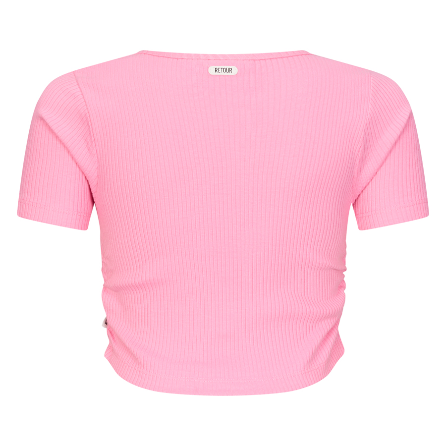 • Een korte nauwsluitende top van ribstof uit de zomercollectie van Retour Jeans met korte mouwen en plooien in de zijnaad.