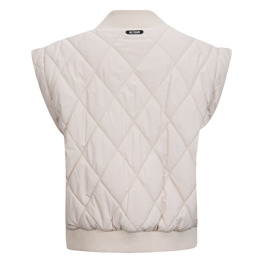 • Gewatteerde jas en bodywarmer in een uit de zomercollectie van Retour Jeans. De jas heeft een ritssluiting voor, zakken met drukknoop aan de voorzijde, een binnenzak met drukknoopsluiting en een opstaande boord langs de hals. Het jack heeft afritsbare mouwen, zodat je een jas en bodywarmer in een hebt. Het jack is gevoed, waterafstotend en winddicht.