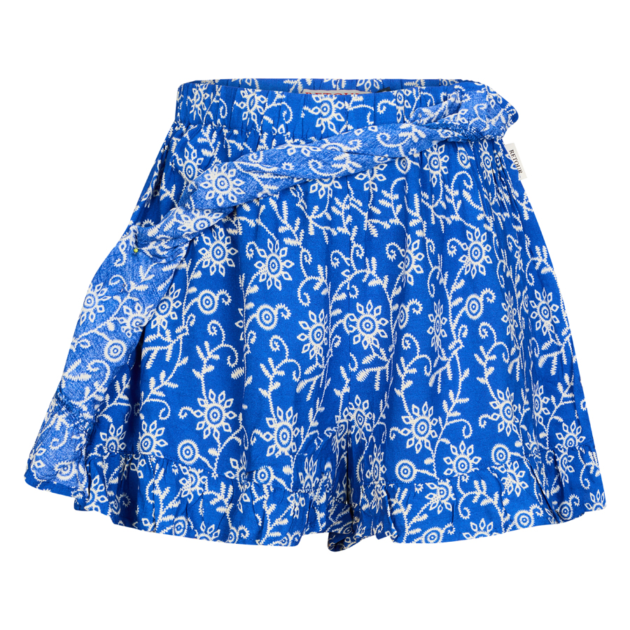 • Een korte skort uit de zomercollectie van Retour Jeans met vastgestikte overslag voor. Het model heeft gedessineerd elastiek in de taille en heeft steekzakken.